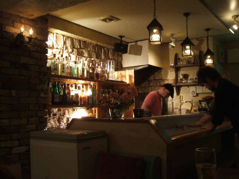 we head back to david’s to rest a bit and then we head back out to find some dinner and either karaoke or a bar. (it’s our last night in kumamoto after-all) david drove us back out into the city and we go into a small bar that serves italian food…. italian bar food o.o… so the portions were smallish 🙁 dave and i got some pizzas, which were actually pretty good! thin-crust 😀 and michee got some pasta dish… the small pizzas were… small. and the large was… small. *sigh* but we were full-ish after another pizza. lol…